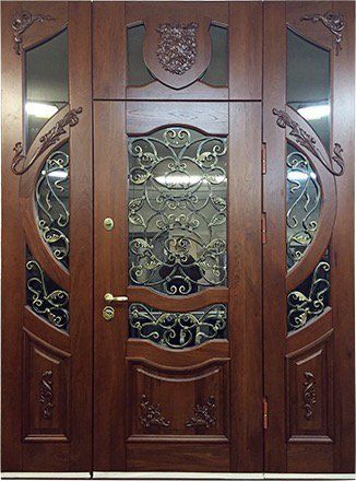Поговорим об отделке. Вариантов декора дверей много. В большинстве случаев, для отделки элитных дверей используется массив натурального дерева или натуральный шпон с фрезеровкой. Цвет двери так же делается по желанию заказчика. Очень красиво и представительно выглядят двери с ковкой и стеклом.